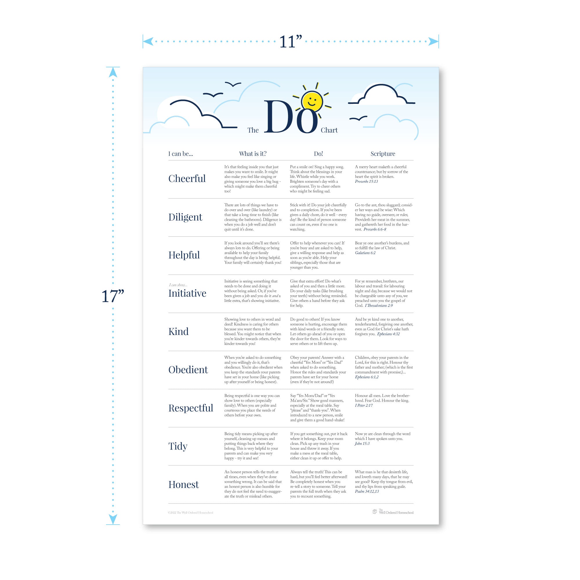 Forms of good behavior covered on the “Do Chart”: Cheerfulness, Diligence, Helpfulness, Initiative, Kindness, Obedience, Respectfulness, Tidiness and Honesty.