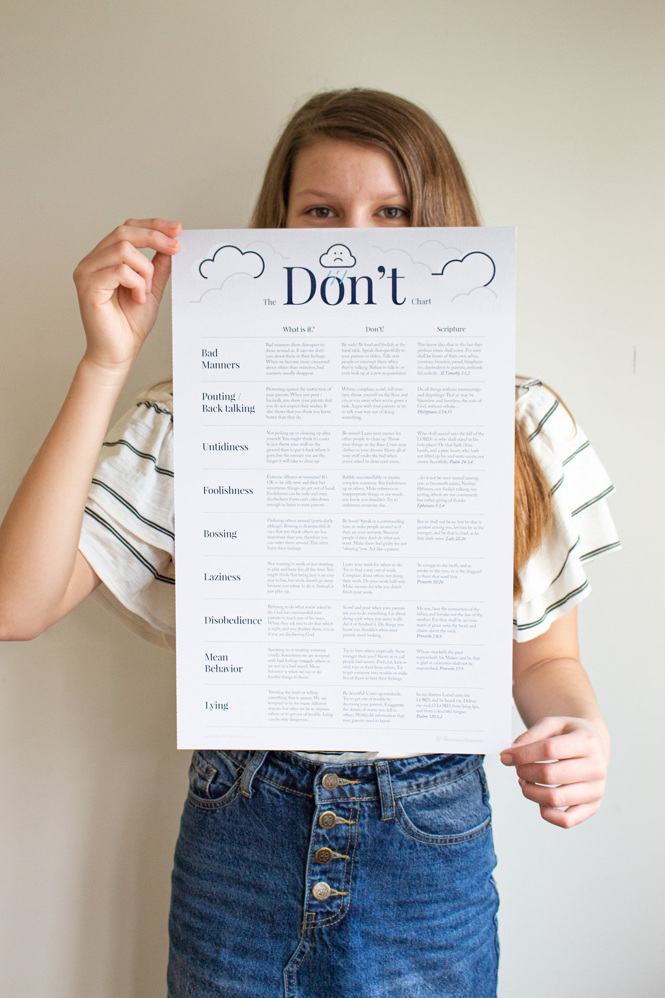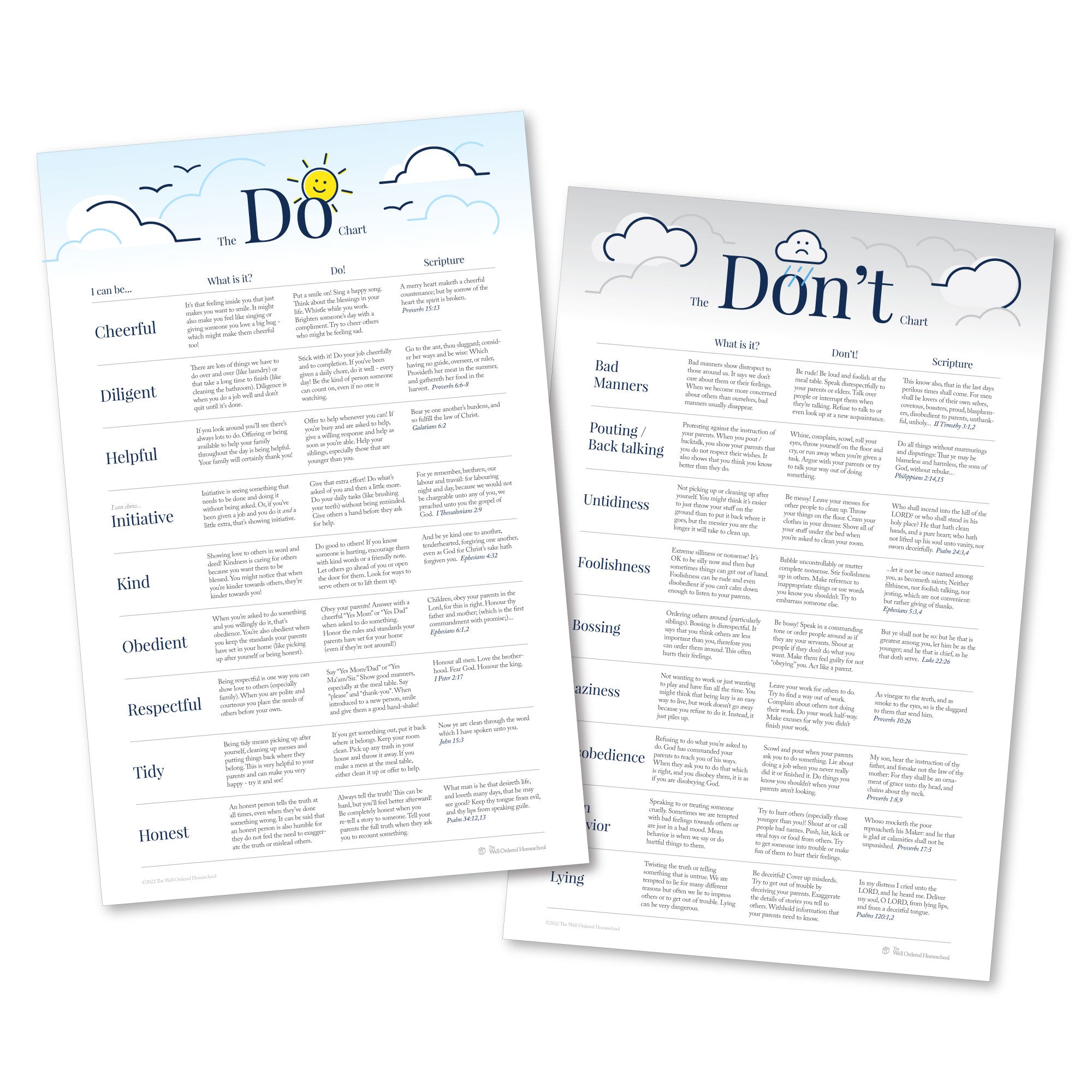 The Do and Don't chart set is an excellent quick reference tool for character training in your home or classroom. Both charts are designed to provide you with the information you need quickly and effectively. They have a clean, attractive design that allows you to display them just about anywhere.