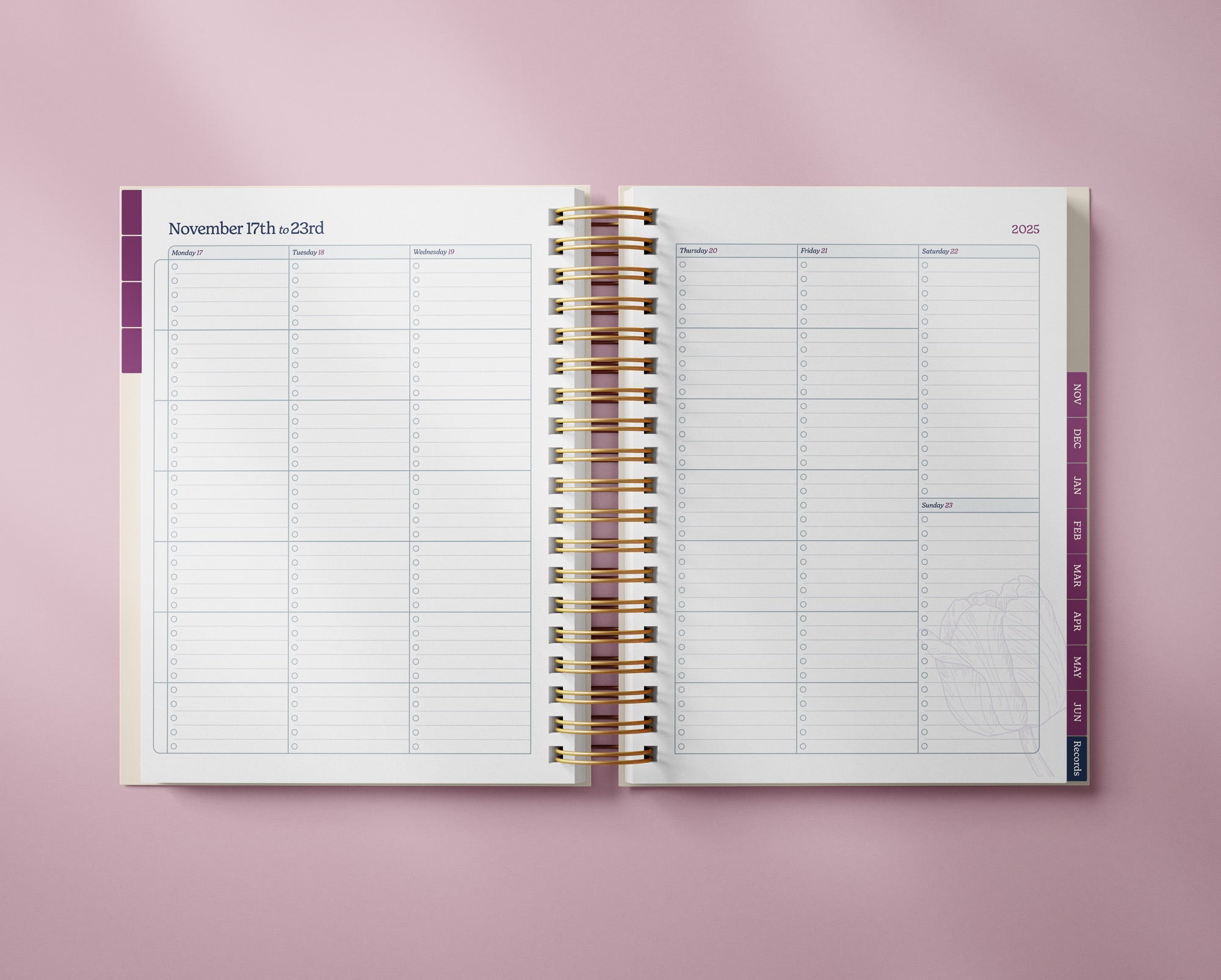 - Monthly overview pages help you organize your thoughts, set goals and chart your course for the month ahead.