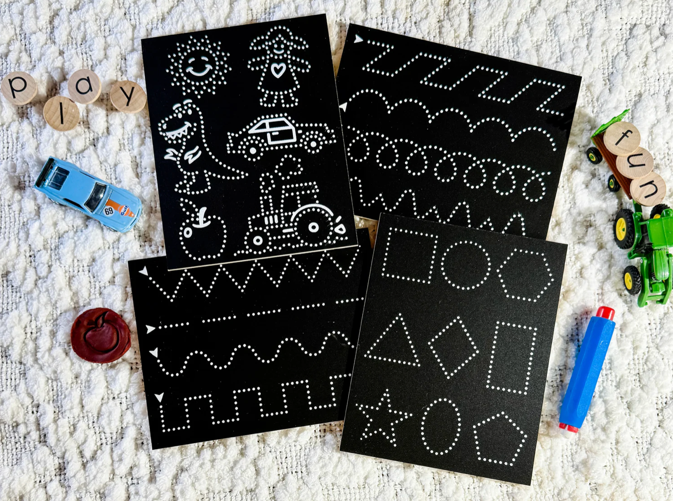 The Pre-Writing Basics Travel Set provides nonstop entertainment for youngsters, simultaneously teaching them the fundamental shapes and patterns necessary for recognizing letterforms. It's the perfect companion for improving handwriting abilities while on the move! This set includes boards filled with easy-to-follow tracing exercises, traceable shapes, and a delightful dot-to-dot picture board.